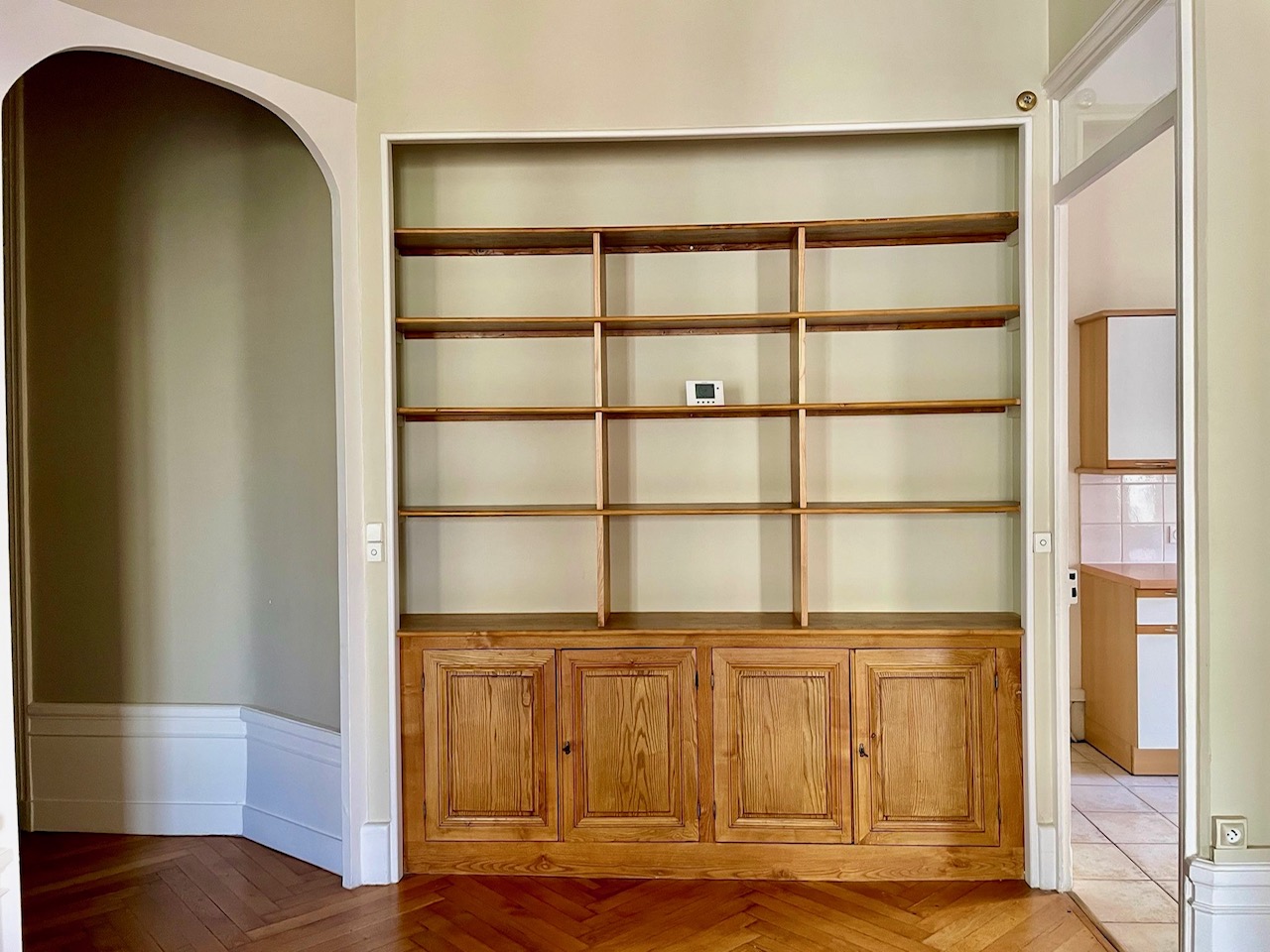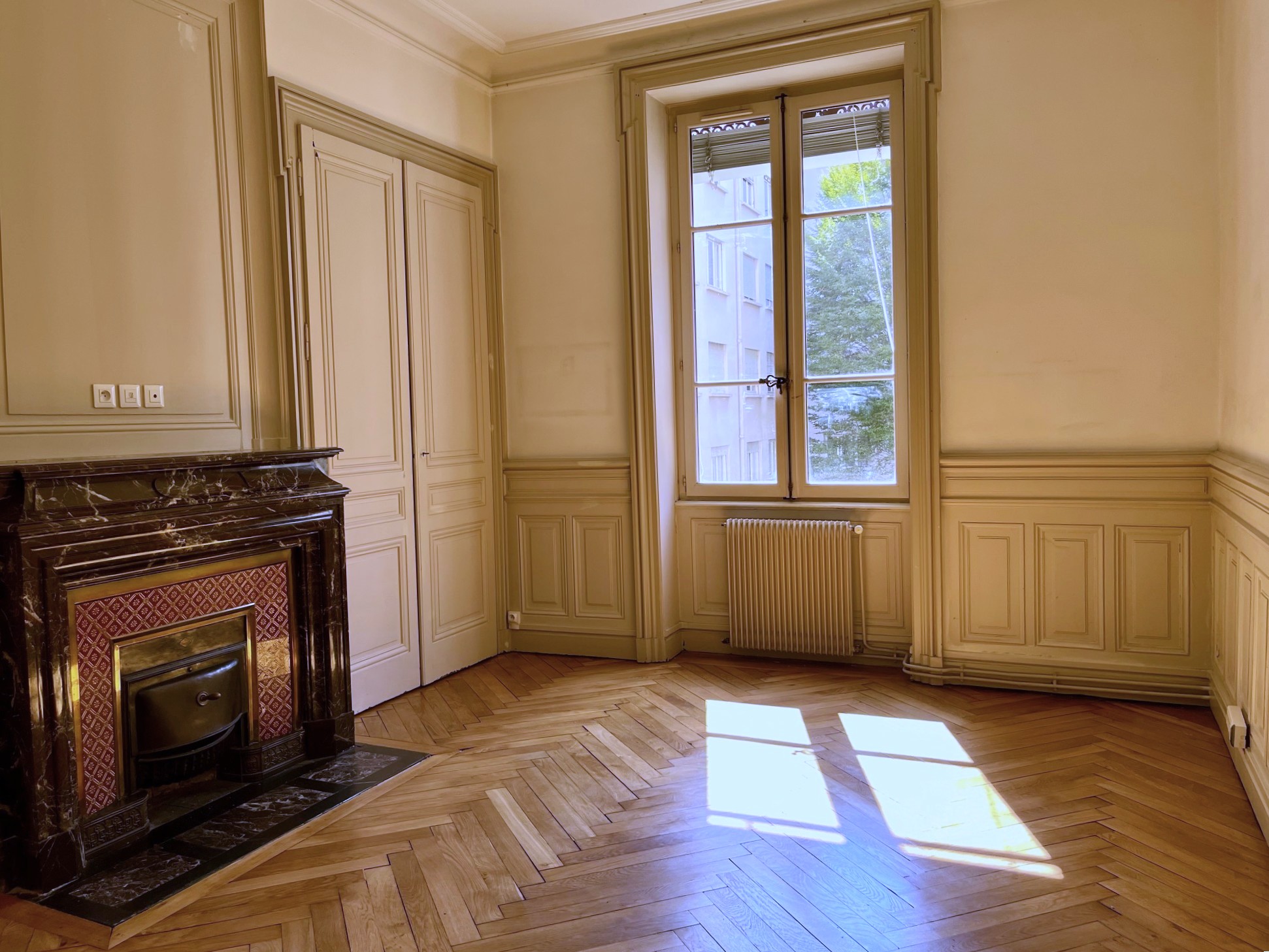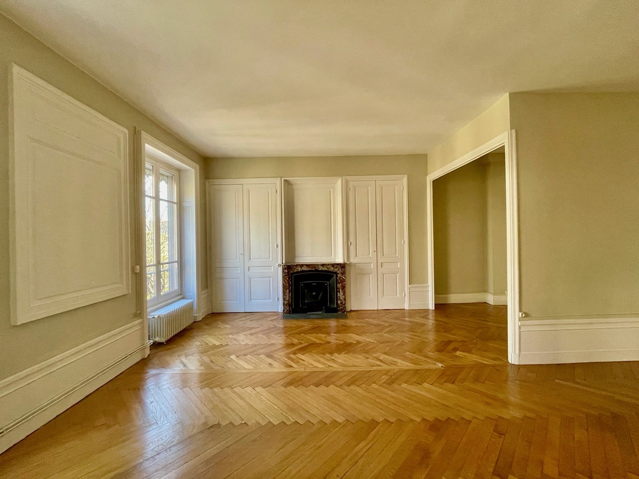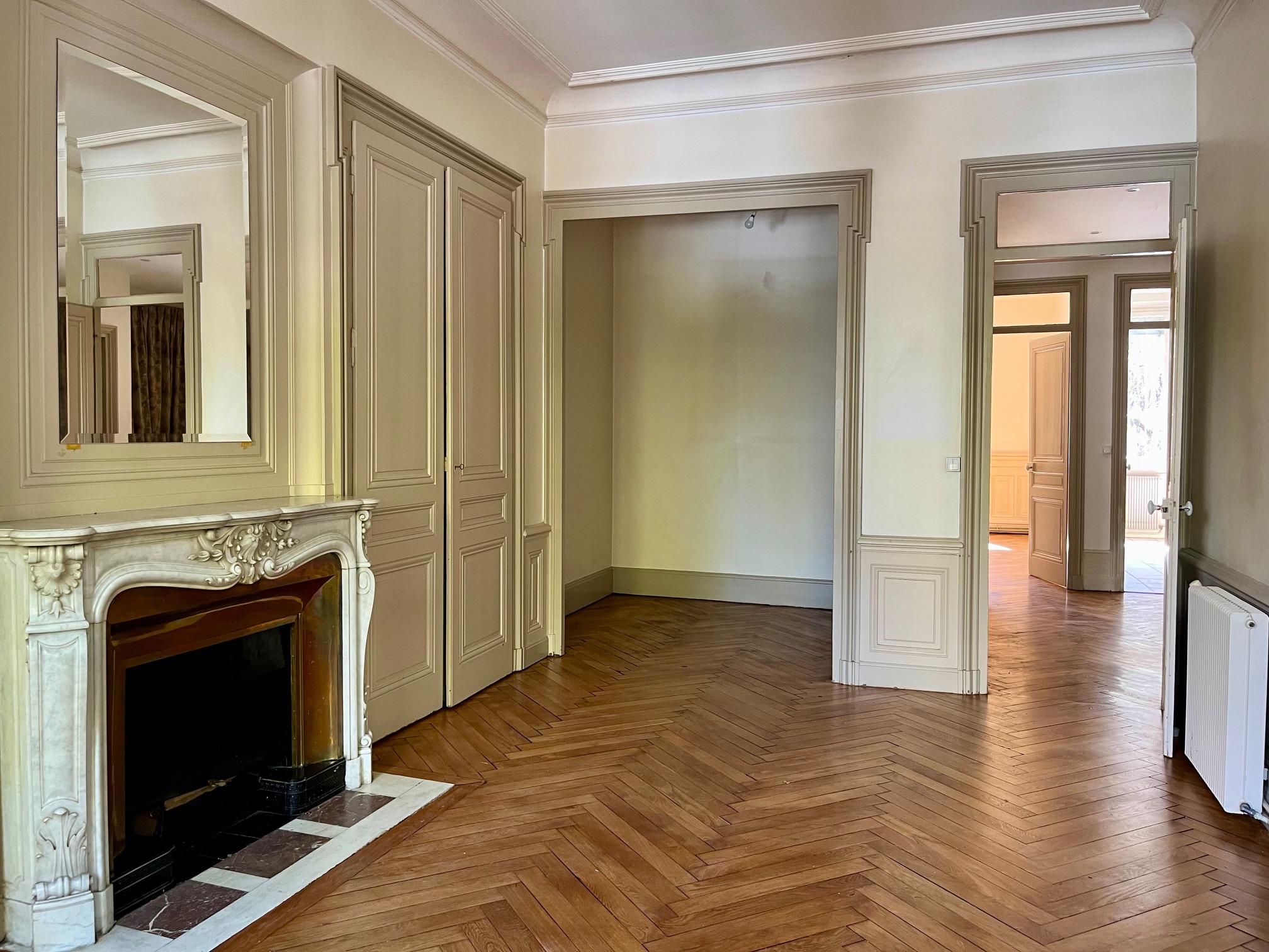 Entièrement rénové, l’appartement a le charme de l'ancien avec des boiseries et des moulures, cheminée, parquet chevron en chêne à bâton rompu.
