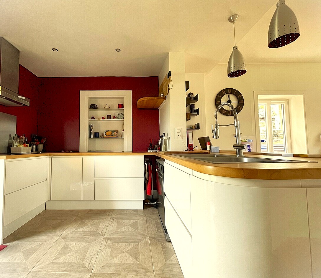 A Villefranche/Gleizé, maison de famille en très bon état, très bien équipée, en pierre dorée de 285 m², 8 pièces, 5 chambres, 4 salles d'eau, dressings, cuisine moderne ouverte sur salle à manger, séjour avec cheminée, combles aménagés en pièce de vie avec kitchenette, salle d'eau, wc.